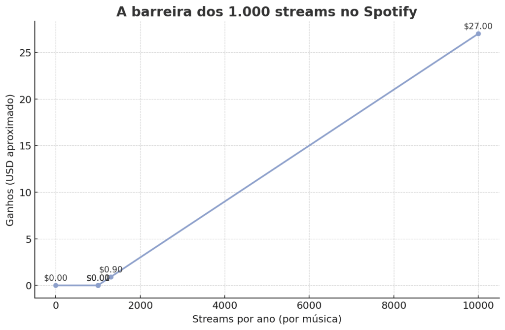 | Spotify | R$ 40,90 | ~0,003 | Pro-rata + barreira de 1.000 | Maior plataforma, pior para pequenos |